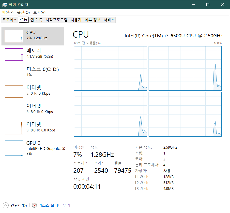 문제는 사용중인 노트북이 삼성 노트북9인데 BIOS에서는 해당 기능 설정을 위한 기능을 별도로 지원하지 않고 있다는 것이다. 정확하게는 해당 기능이 Supported로 되어 있으며 별다른 설정없이 사용 가능하도록 되어 있었다. 이는 아래 그림 2와 같이 작업관리자에서도 확인할 수 있었다. 아래 그림의 가상화 부분을 보면 "사용"하고 있다고 나와 있다.