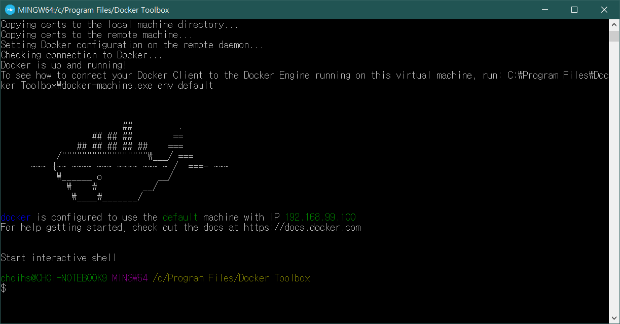 해당 기능을 끄고 다시 Docker Toolbox를 실행시키며 아래와 같이 정상적으로 실행됨을 확인할 수 있다.
