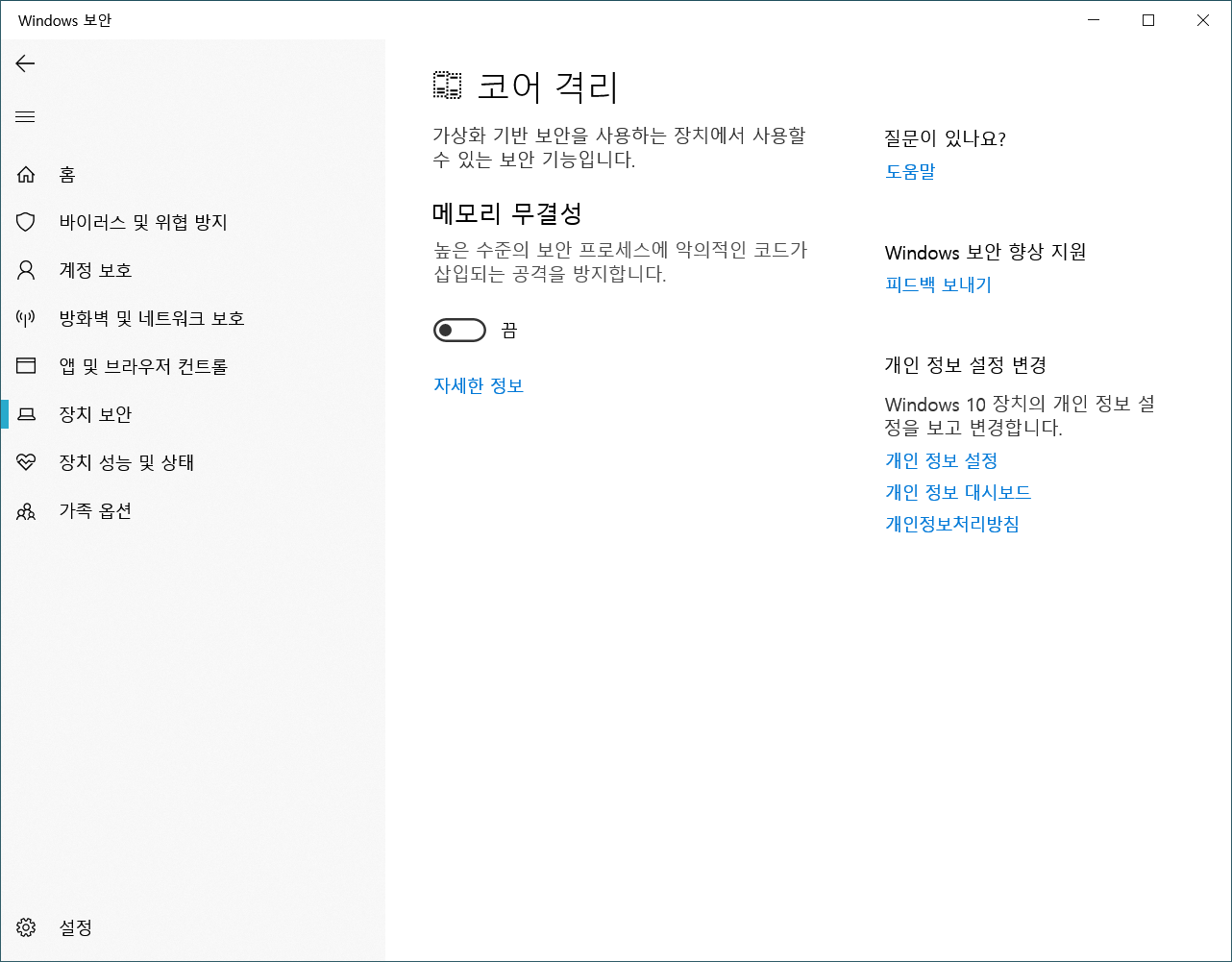 Windows 보안 → 장치 보안 → 코어 격리 세부 정보 → 메모리 무결성 기능 끔(OFF)