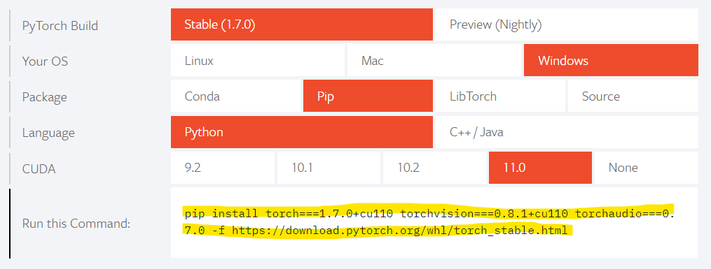 pip 설치하는 경우, 파이토치 홈페이지에서 INSTALL PYTORCH 에서 해당하는 부분들을 선택한 후 명령어를 복사하여 console에서 실행하면 된다. 그러면 자동으로 이전 버전을 uninstall 하고 업그레이드 된 버전을 설치한다.